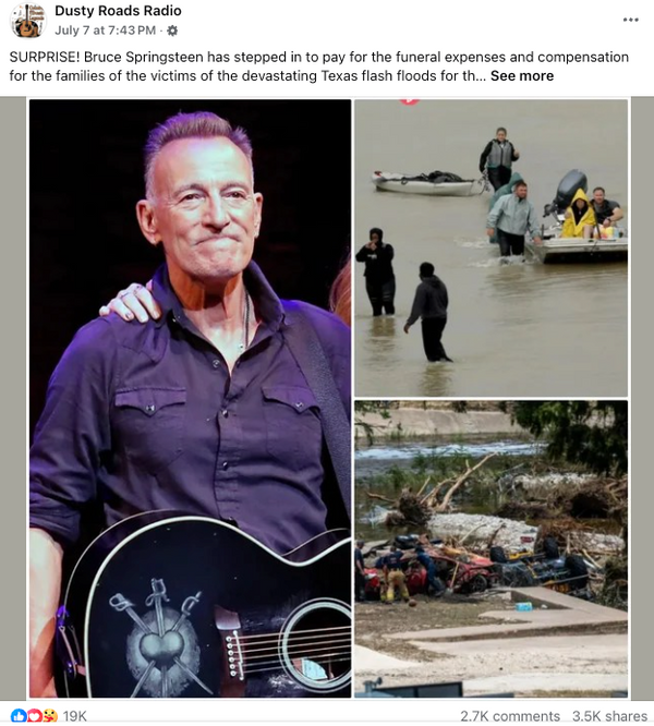 For example, on July 7, the Facebook page Dusty Roads Radio posted (archived) about Springsteen’s alleged generous donation, receiving over 19,000 reactions and nearly 3,000 comments. The post also included a photo of Springsteen on stage among a collage of images from the disaster.