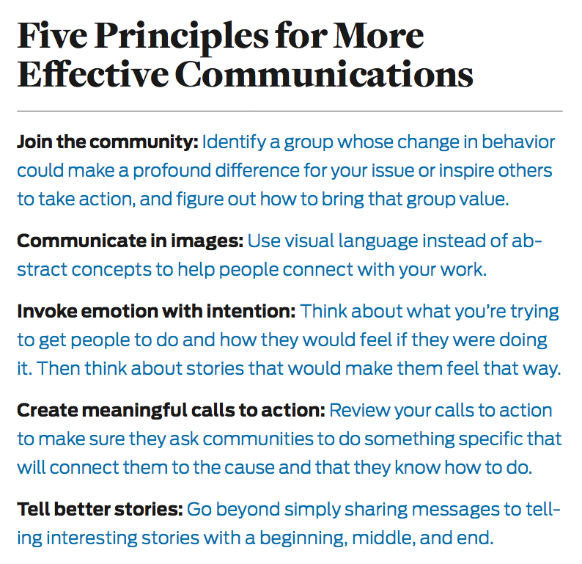 How to apply this insight: Are you telling stories with a beginning, middle, and end, or simply sharing messages? What new insights will your audiences gain from hearing these stories? Are your stories interesting enough in their own right to merit a listen—even if the listener isn’t passionate about your issue? And are you using the empty and full spaces of your stories to help people gain new insights on topics and issues they assume they know well?