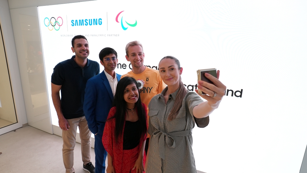 ▲ (From left) Omar Bassyouni, Zubair Junjunia, Johannes Floors of Team Germany, Shomy Chowdhury and Jessie Niles, pose for a Victory Selfie with Para athlete Johannes Floors of Team Germany using the Galaxy Z Flip6’s Show Palm feature.